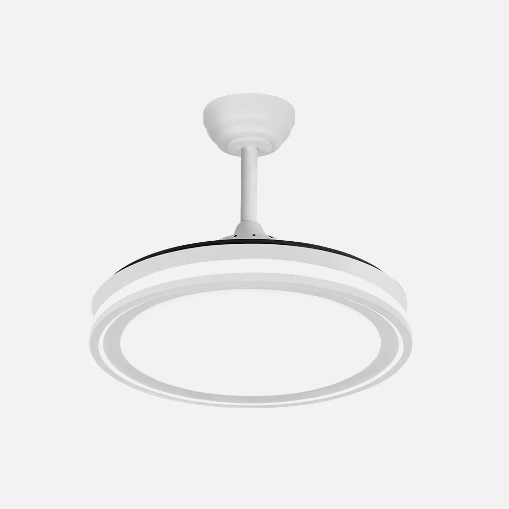 Ventilador DC de la serie BANDIDO realizado en metal, ABS y policarbonato en color BLANCO con cuatro aspas DESPLEGABLES transparente muy resistentes. Tiene seis velocidades ajustables. Tecnología LED integrada con una potencia de 59W, con 3 TEMPERATURAS SELECCIONABLES DE LUZ (3500-4000-6500K) y 5900 lúmenes. Control de aire verano o invierno. Su medida es de 35,5/45,5X48 centímetros con las aspas plegadas y de 35,5/45,5X107 centímetros con las aspas desplegadas. Incluye dos tijas de 10 y 20 centímetros, para colocar a distintas alturas. Mando a distancia INCLUIDO y TEMPORIZADOR 1/2/4 H.