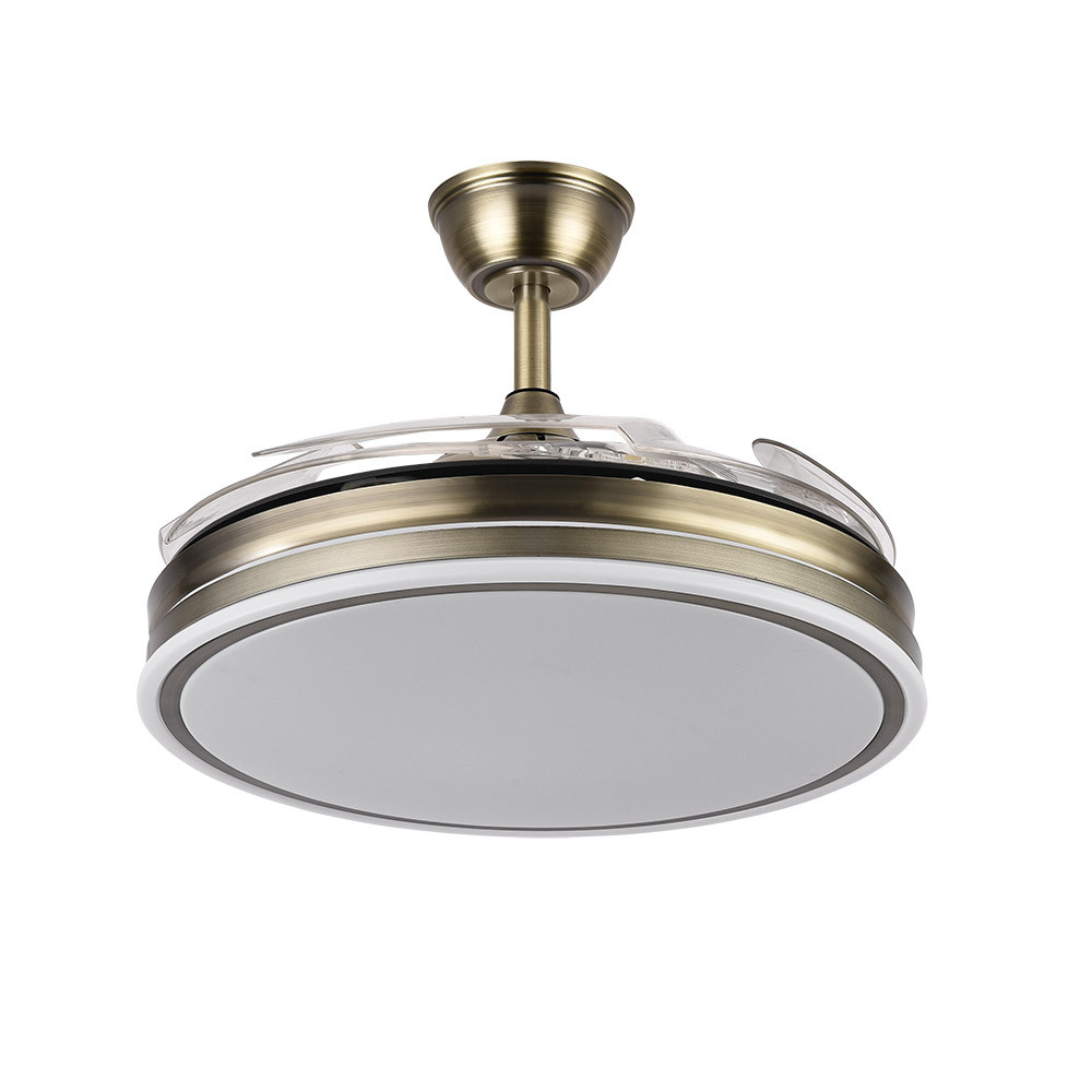 Ventilador Bayomo 107cm cuero realizado en metal y policarbonato, en color CUERO con cuatro aspas DESPLEGABLES de ABS transparente muy resistentes. Motor DC. Tiene seis velocidades ajustables. Tecnología LED integrada con una potencia de 59W, con 3 TEMPERATURAS DE LUZ (3000-4000-6000K) y 6980 lúmenes. Control de aire verano o invierno. Su medida es de 34,5/42X50X50 centímetros con las aspas plegadas y de 34,5/42X107X107 centímetros con las aspas desplegadas, con dos medidas de tija para instalarlo a diferentes alturas. Mando a distancia INCLUIDO, REGULABLE EN INTENSIDAD, con MEMORIA DE COLOR incorporada y TEMPORIZADOR 2/4 H. Modelo disponible en color Níquel, Cuero, Blanco y en color Negro.