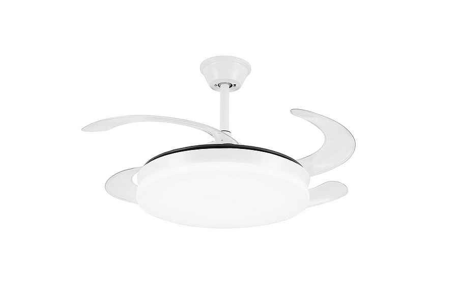 Ventilador ISABELLA XL con motor dc 35w, 6 velocidades, 4aspas, mando a distancia, app, función verano / invierno luz cct 45w+45w, 50cm cerrado y 122cm abierto, altura regulable 32cm/42cm, disponible en blanco.