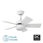 Ventilador DC serie MARTA de color NÍQUEL con cinco aspas REVERSIBLES en color HAYA/PLATA y seis velocidades. Sus dimensiones son 41x76x76 centímetros. Posee Tecnología LED integrado con una potencia de 36 W, 3240 lúmenes y luz regulable en 3 posiciones (3000k color blanca cálida, 4000k color blanca neutra, y 6000k color blanca fría), además de memoria de color. Tiene control remoto INCLUIDO con la opción verano/invierno y la opción de temporizador de 1 hasta 4 horas. El cuerpo del ventilador es de metal y policarbonato; y las aspas de MDF. Disponible también en color Cuero-Cerezo/Nogal y en Blanco-Blanco/Haya.